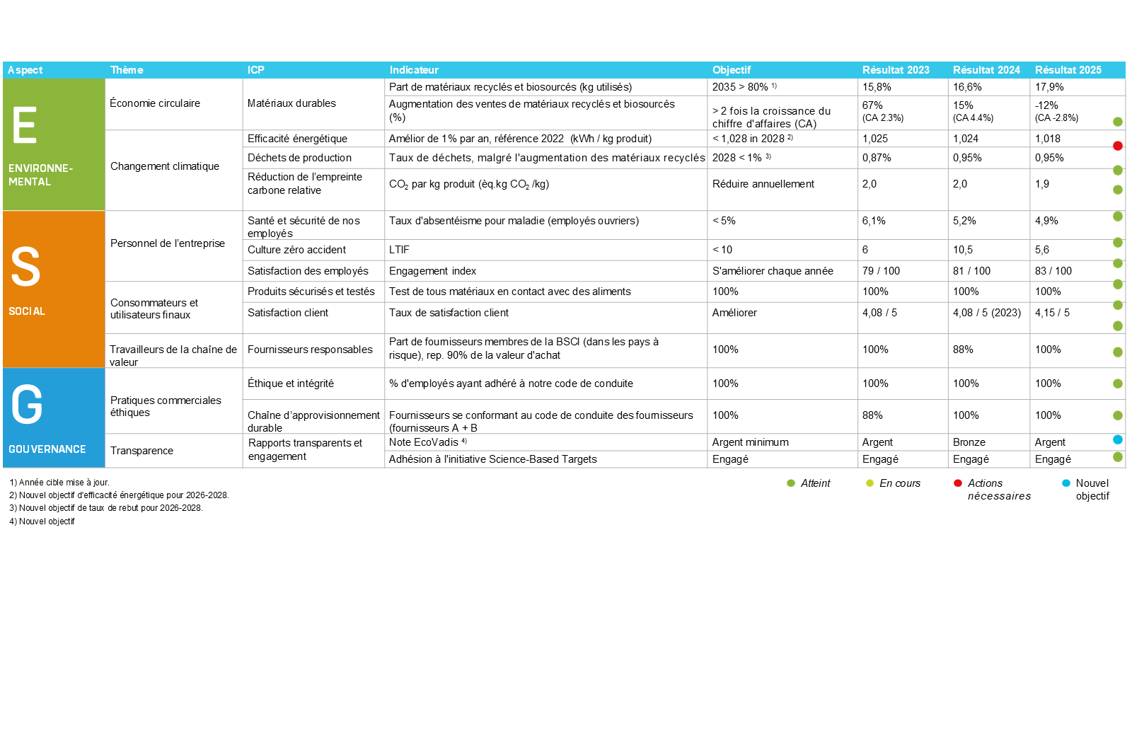 La stratégie de développement durable d’Orthex, les sujets pertinents en la matière, et les indicateurs, objectifs et résultats atteints en 2025 sont illustrés ci-dessous.