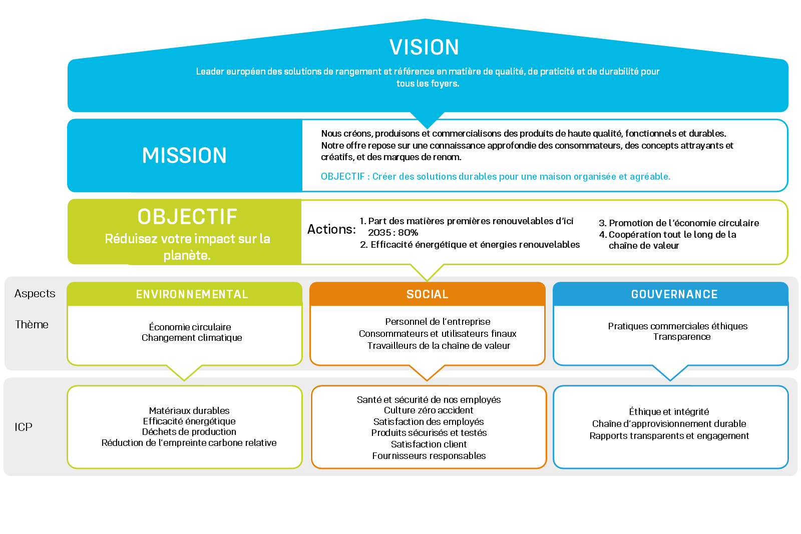 Chez Orthex, nous avons identifié des enjeux prioritaires en matière de développement durable selon les critères environnementaux, sociaux et de gouvernance (ESG). Ces enjeux prennent appui sur l’analyse de matérialité qui a été faite en 2025. Pour chaque sujet, nous avons défini des indicateurs clés de performance (ICP) et des objectifs.